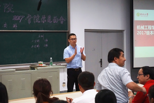 接着机械工程学院副院长、“长江学者”陈云飞教授为大家带来了精彩的演讲。陈云飞老师从宏观和微观两方面,对机械工程这一学科作了详细的介绍,并鼓励大家多钻研学习,多读好书,同时更须养成锻炼身体的好习惯,给2017级新同学们上了生动的一课。
