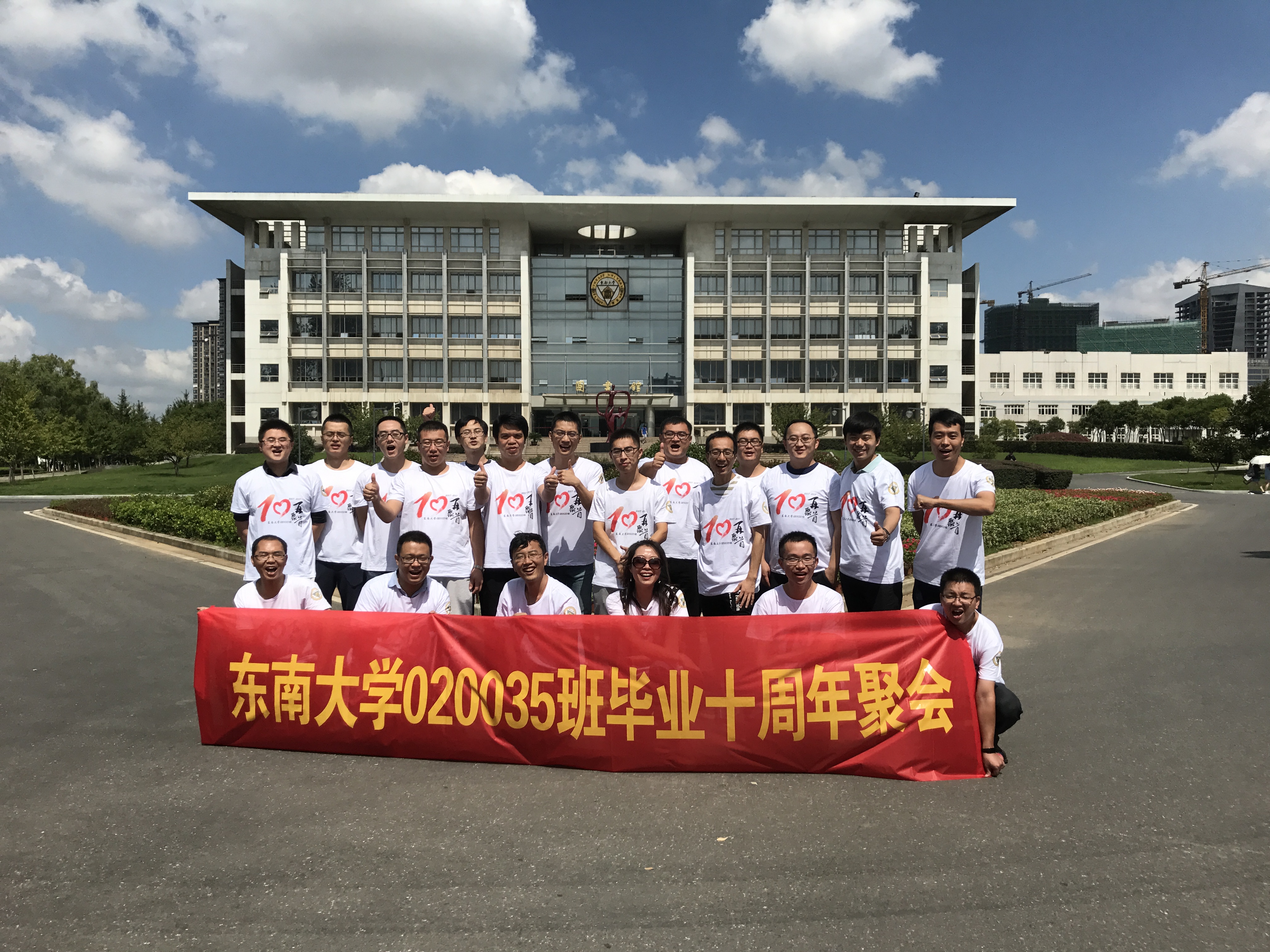2017年9月17日,原020035班校友一行17人回母校庆祝毕业十周年。同学们一起漫步于六朝松下,大礼堂前,九龙湖畔,一  起回忆当初,共叙友情。学院校友会付瑜老师和胡涛老师代表学院热情接待了各位校友。