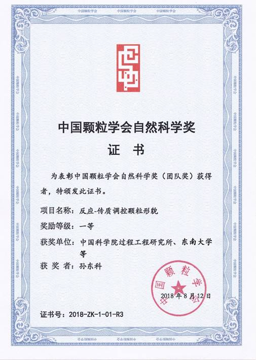 2018年度中国颗粒学会自然科学奖揭晓。我院孙东科教授与中科院过程工程研究所韩永生研究员、西北工业大学邢辉教授、中国石油化工股份有限公司高级工程师林强博士等合作完成的“反应-传质调控颗粒形貌”项目荣获中国颗粒学会自然科学一等奖。