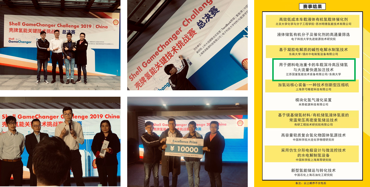 2019年11月26日,壳牌Game Changer 2019氢能关键技术挑战赛决赛在中科院上海高等研究院举办。本次大赛历时三个月,汇集了来自全球7个国家的83个氢能源领域提案。由星空网官方站入口氢能装备研发团队与江苏国富氢能技术装备有限公司联合提出的“用于燃料电池重卡的车载深冷高压储氢与大流量快速加注技术”技术解决方案成功入围总决赛十强,并最终获得优胜奖(Excellence Prize)。
