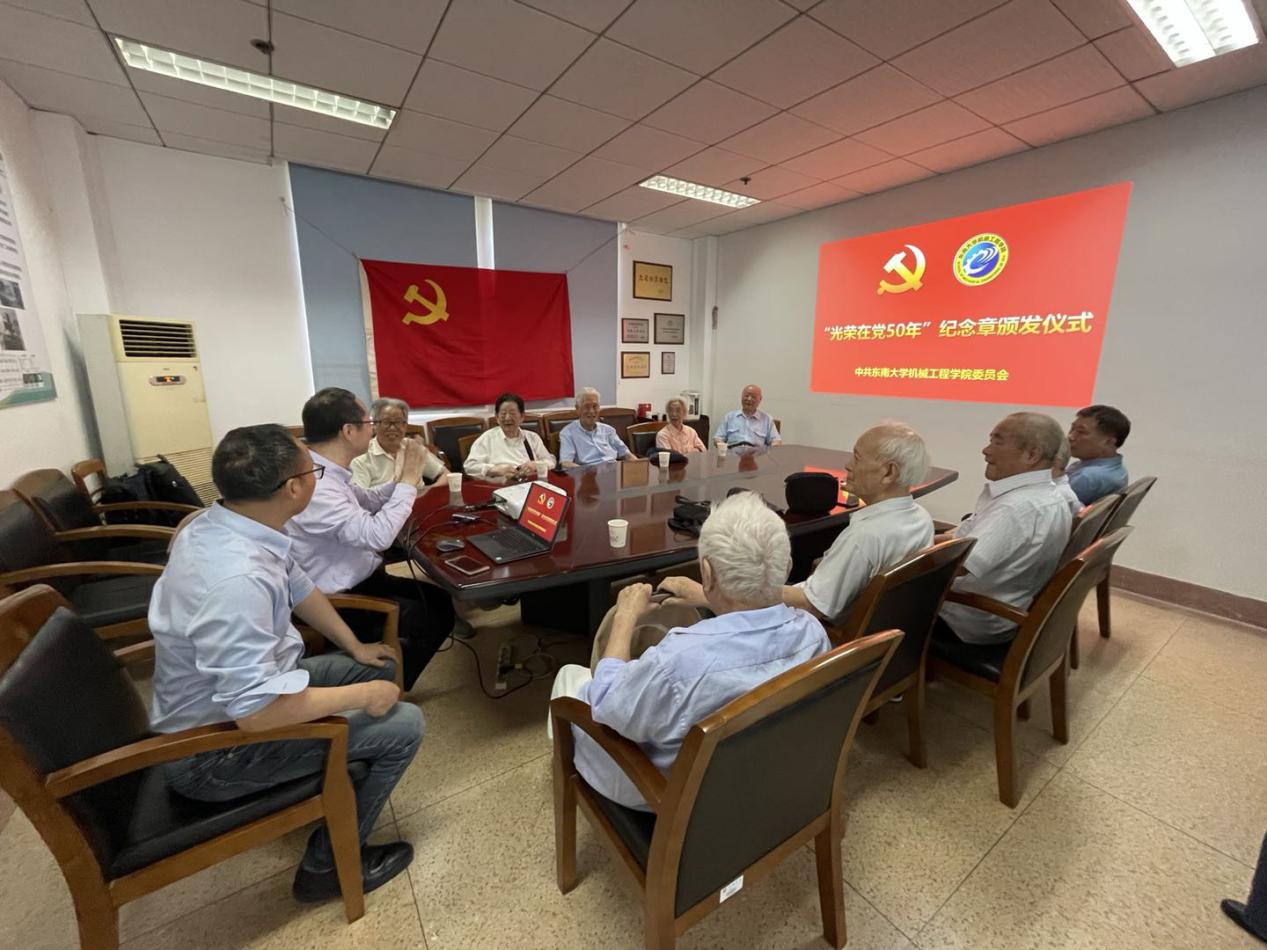 在庆祝中国共产党成立100周年之际,党中央决定颁发“光荣在党50年”纪念章。6月21日上午,机械工程学院在四牌楼校区电光源中心举行简朴隆重的仪式,向学院“光荣在党50年”老党员代表颁发纪念章。机械工程学院党委书记张志胜,机械工程学院院长倪中华,代表学院党委向荣获纪念章的老党员颁发纪念章。机械工程学院副院长陈震、电光源中心党支部书记张建忠参加了仪式。
