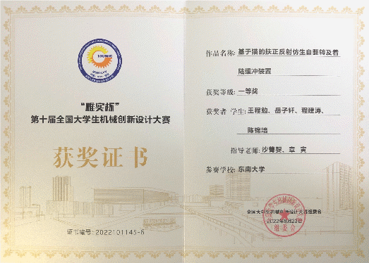 此前,该团队在江苏省机械创新设计竞赛中获得一等奖,代表江苏省参加全国大赛。受疫情影响,此次全国大赛采用线上评审的方式,增加了作品展示的难度。同时,大赛作品要求符合仿生或生态修复的主题,充分考验了学生的创新能力。经过决赛第一阶段评审与第二阶段答辩,通过原理讲解、视频展示等形式,向评审老师展示了作品的结构原理、制作工艺、功能实现以及创新点。最终,经过组委会专家严格评审,该作品获得本届国赛一等奖,在全国决赛中展示了东大风采!