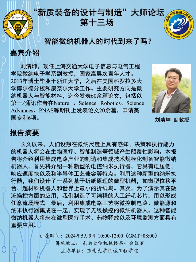 刘清坤,现任上海交通大学电子信息与电气工程学院微纳电子学系副教授,国家高层次青年人才。2013年博士毕业于浙江大学,之后在美国科罗拉多大学博尔德分校和康奈尔大学工作。主要研究方向是微纳机器人与智能材料,迄今发表60余篇论文,包括以第一/通讯作者在Nature 、Science Robotics、Science Advances、PNAS等期刊上发表论文20余篇,申请美国专利6项。