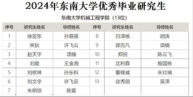 我院2024年毕业研究生在校期间,刻苦学习、努力科研、顺利完成学业,涌现出一批思想政治素质合格、学习成绩优异、科学研究突出、社会工作积极的优秀毕业生。经过学院推荐、学校审核并公示,我院徐亚东等13位研究生获2024年东南大学“优秀毕业研究生”称号。名单如下: