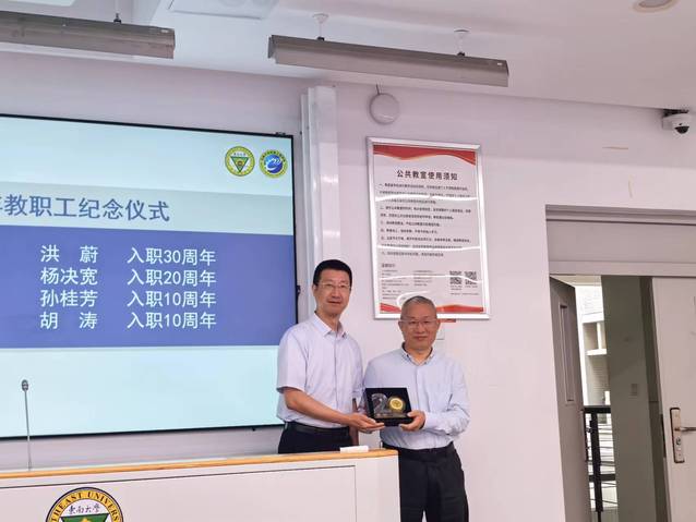 随后,举行了入职整十年教职工纪念仪式,机械工程学院费庆国院长为入职30年的洪蔚老师、20年的杨决宽老师颁发纪念牌,学院全体教师以热烈的掌声向这些辛勤付出的老师表达了崇高的敬意和由衷的感谢。
