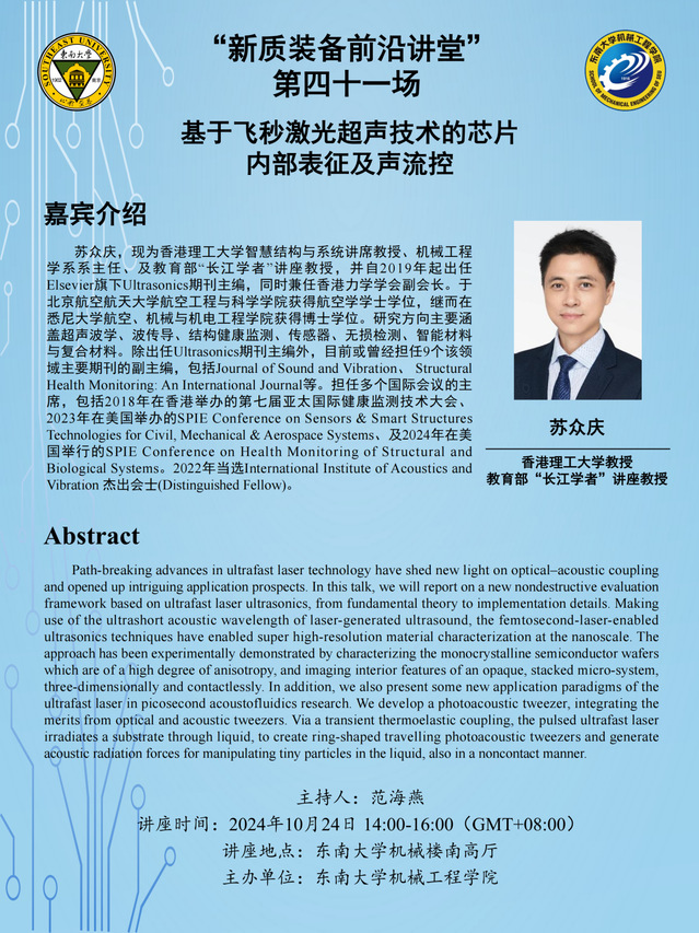 “新质装备前沿讲堂”第四十一场:苏众庆教授——基于飞秒激光超声技术的芯片内部表征及声流控