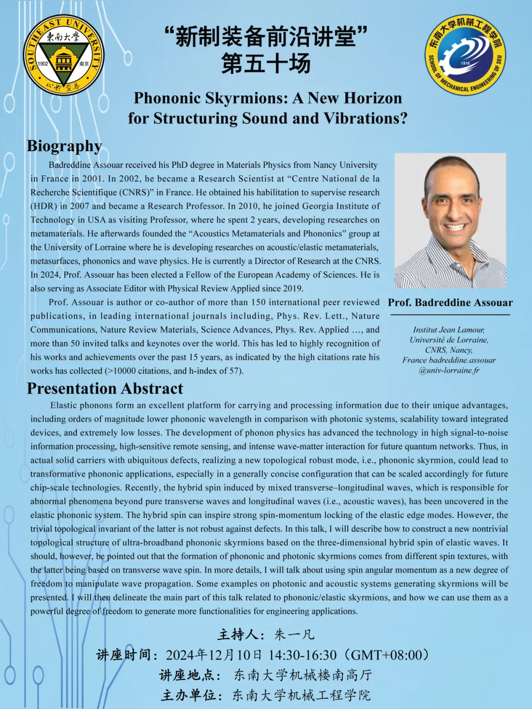 “新质装备前沿讲堂”第五十场:Prof. Badreddine Assouar——Phononic Skyrmions: A New Horizon for Structuring Sound and Vibrations?