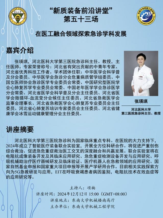 2024年12月12日,由星空网官方站入口主办的“新质装备前沿讲堂”第五十三场在东南大学机械楼南高厅成功举办。本次活动特别邀请了河北医科大学第三医院急诊科主任张瑛琪教授作为主讲嘉宾,开展了关于“在医工融合领域急诊学科发展”的学术报告。报告会由项楠老师主持,河北医科大学第三医院急诊科副主任李梅、南京航空航天大学姚佳烽老师、朱桂平老师、刘凯老师共同出席了本次活动。