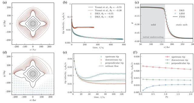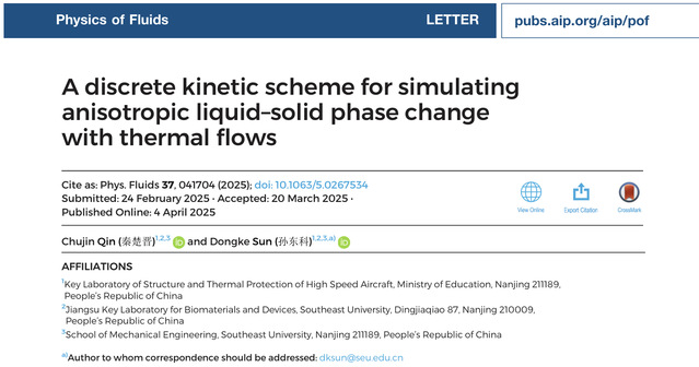 近日,我院2022级直博生秦楚晋在热对流作用下枝晶生长建模方面取得新进展,相关研究成果以“A discrete kinetic scheme for simulating anisotropic liquid-solid phase change with thermal flows”为题发表在《Physics of Fluids》(流体物理学,PoF)。该期刊是流体力学领域的权威期刊之一,自1958年创刊以来,PoF始终致力于发表流体动力学领域的高质量原创研究,涵盖理论分析、数值模拟和实验探索,是美国物理联合会AIP旗下JCR一区、中科院二区期刊。