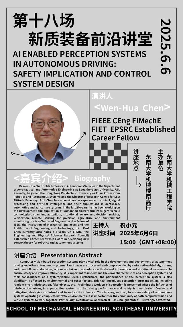 2025年机械学院“新质装备前沿讲堂”第十八场:Prof. Wen-Hua Chen——AI Enabled Perception Systems in Autonomous Driving:Safety Implication and Control System Design