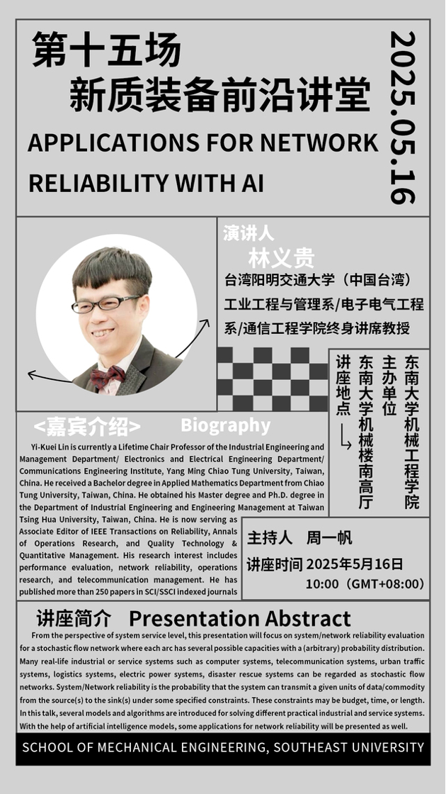 5月16日,中国台湾阳明交通大学工业工程与管理系/电子电机工程系/通讯工程研究所林义贵教授受邀来我院就“APPLICATIONS FOR NETWORKRELIABILITY WITH AI”主题开展学术讲座。林义贵教授分享团队的主要研究进展,重点讨论随机流量网络的系统/网络可靠性评估,并介绍几种用于解决不同实际工业和服务系统问题的模型和算法。本次讲座由周一帆教授主持,我院相关研究领域的师生参与本次讲座。