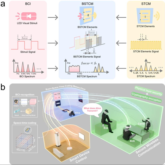 研究团队提出了一种脑机时空编码超表面(brain space-time-coding metasurface,BSTCM)平台,该平台将基于SSVEP的脑机接口视觉刺激与外部环境的信息交互无缝集成,提高了系统的紧凑性和可靠性,如图1所示。成果展示了一个结合物理层安全和密码学加密方法的安全加密无线通信系统,利用提出的BSTCM平台实现了远程意念控制智能设备提出的脑机时空编码超表面将电磁操纵能力与人脑智能相结合,为人机界面和未来6G无线通信应用之间的交互提供了一种具有潜力的解决方案。