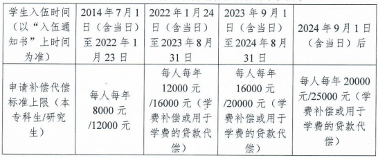 根据《财政部、教育部、中国人民银行、金融监管总局关于调整完善国家助学贷款有关政策的通知》(财教〔2024〕188号)规定,自2024年秋季学期起,服兵役资助学费补偿、用于学费的国家助学贷款和学费减免标准调整为本专科学生每人每年最高不超过20000元、研究生每人每年最高不超过25000元。近年不同时间入伍的学生,适用的学费补偿或贷款代偿申请标准如下: