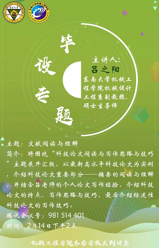 214日下午,毕业设计专题首场线上首场讲座开讲,由机械工程学院副教授、硕士生导师吕之阳老师围绕“科技论文阅读与写作思路与技巧”主题展开讲解。吕老师以最新高水平科技论文为实例,介绍科技论文重要部分——摘要的阅读理解,并结合吕老师的个人协作经验,介绍科技论文的特点、写作思路与技巧,并对综述性科技论文的写作技巧进行了详细阐述。在讲座的最后,吕老师针对同学们的问题发表了自己独特的见解,同学们收获颇丰。