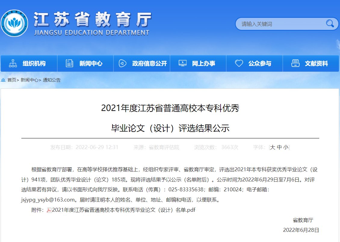 近日,江苏省教育厅公示了2021年省普通高校本专科优秀毕业设计(论文)评选结果,我院获优秀毕业设计(论文)二等奖1项,团队优秀毕业设计(论文)1项。