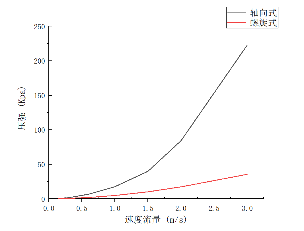 2. 两种水道对比我们可以发现在同种流速下,轴向式水道的进出口压力平均值要高于螺旋式水道,并且螺旋式水道随着入口流速增加而增加的趋势比较缓;