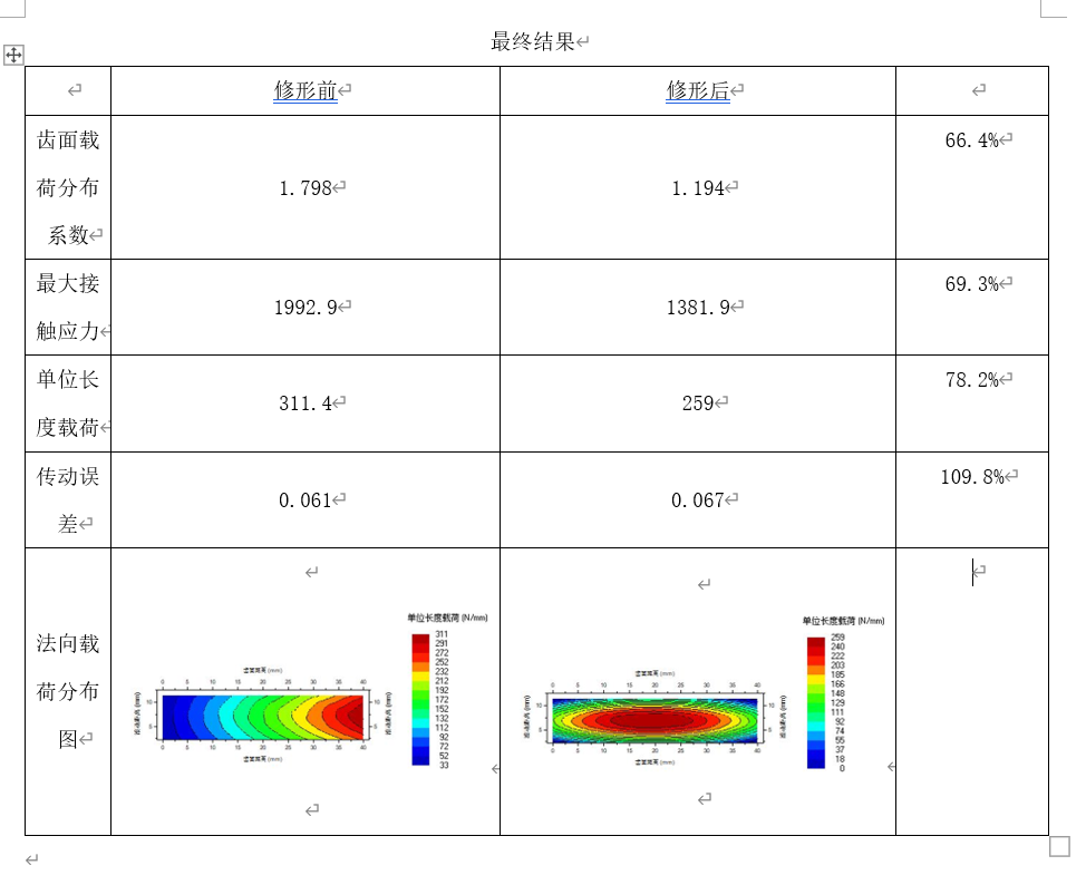 2. 利用KISSsys软件得出的配齿参数,在Romax软件里建立模型并进行仿真,修形前后齿面载荷分布系数、最大接触应力、单位载荷长度、法向载荷分布均得到改善,传动误差略有增加但修形后数据在合理范围内;